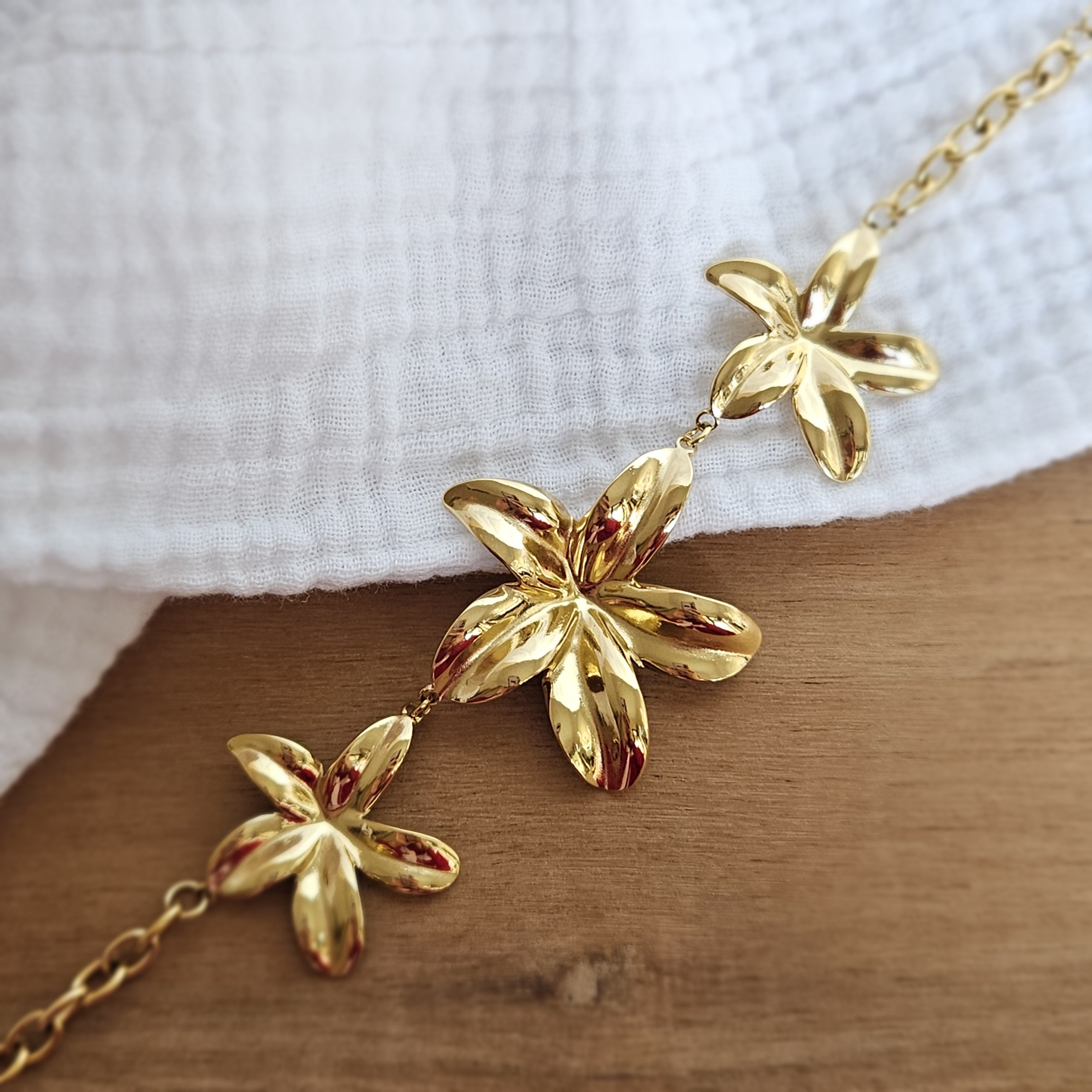 Ce bijou fin arbore trois délicates fleurs ajourées en enfilade, symboles de douceur et de féminité, sur une chaîne extensible qui s’adapte facilement à toutes les tailles de poignet. Réalisé en acier inoxydable doré ou argenté, il résiste à l’usure quotidienne sans ternir, tout en restant léger et confortable. Parfait seul pour un style minimaliste ou superposé avec d’autres bracelets pour un look bohème chic. Idéal au quotidien, en cadeau ou pour rehausser vos tenues préférées avec une note poétique discrète.