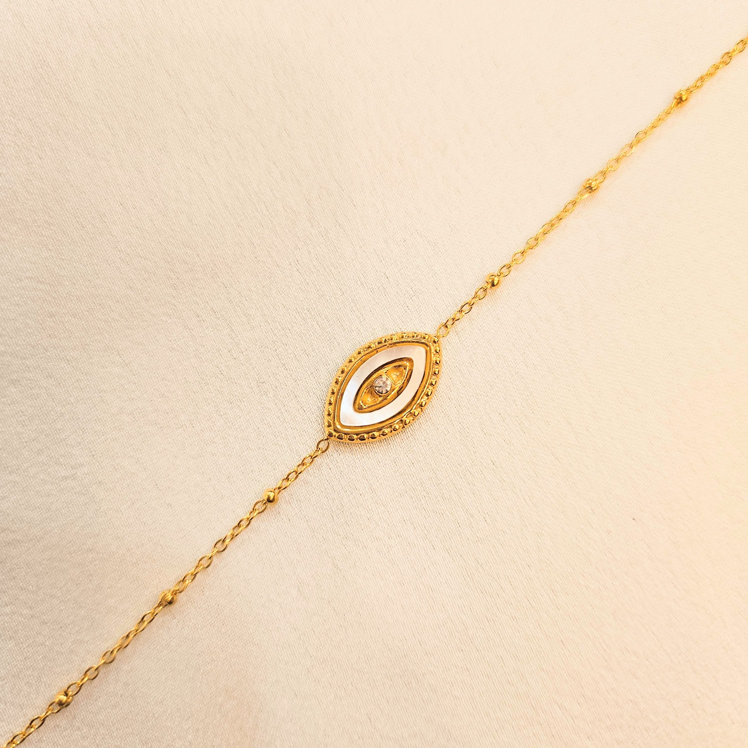 Ce Bracelet en acier inoxydable doré et son œil nacré un modèle très tendance qui nous fait craquer. Il est résistant à l’eau et au temps. Fini les bijoux qui verdissent et se ternissent.