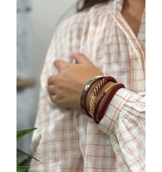Découvrez en boutique ce bijou de maison Kizo, le Bracelet Népalais bordeaux Uni, (moitié doré, moitié bordeaux.)