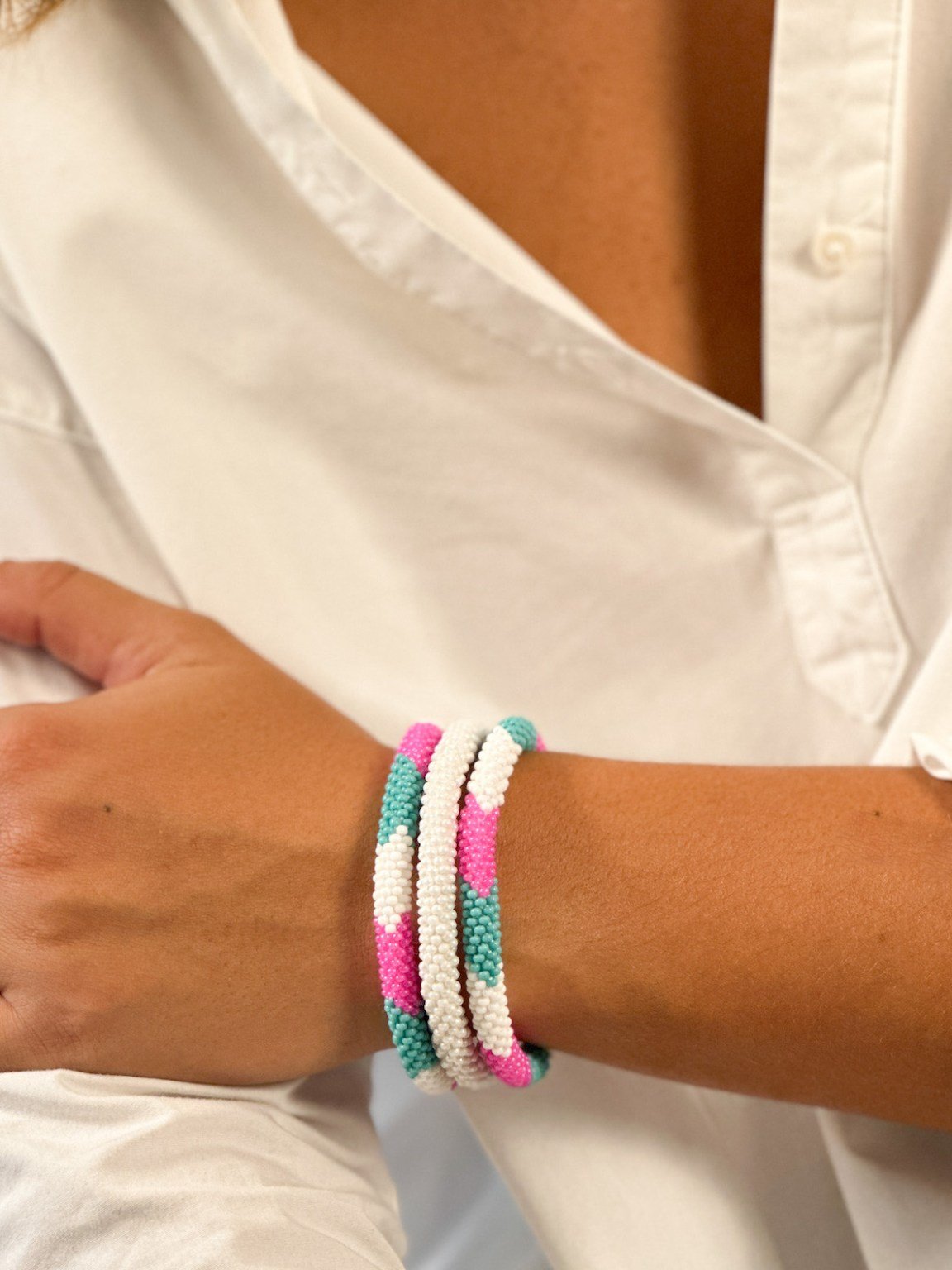Les femmes népalaises avec lesquelles nous travaillons sont indépendantes et fabriquent les bracelets sur leur temps libre, dans leur village près de Katmandou. Avec une grande dextérité, les créatrices enfilent les perles de verre sur un fil résistant, créant souvent des motifs spécifiques.