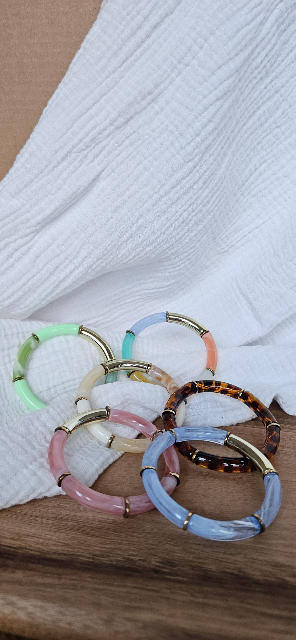 Ce bracelet élastiqué se compose de perles longues en acétate aux teintes vibrantes.