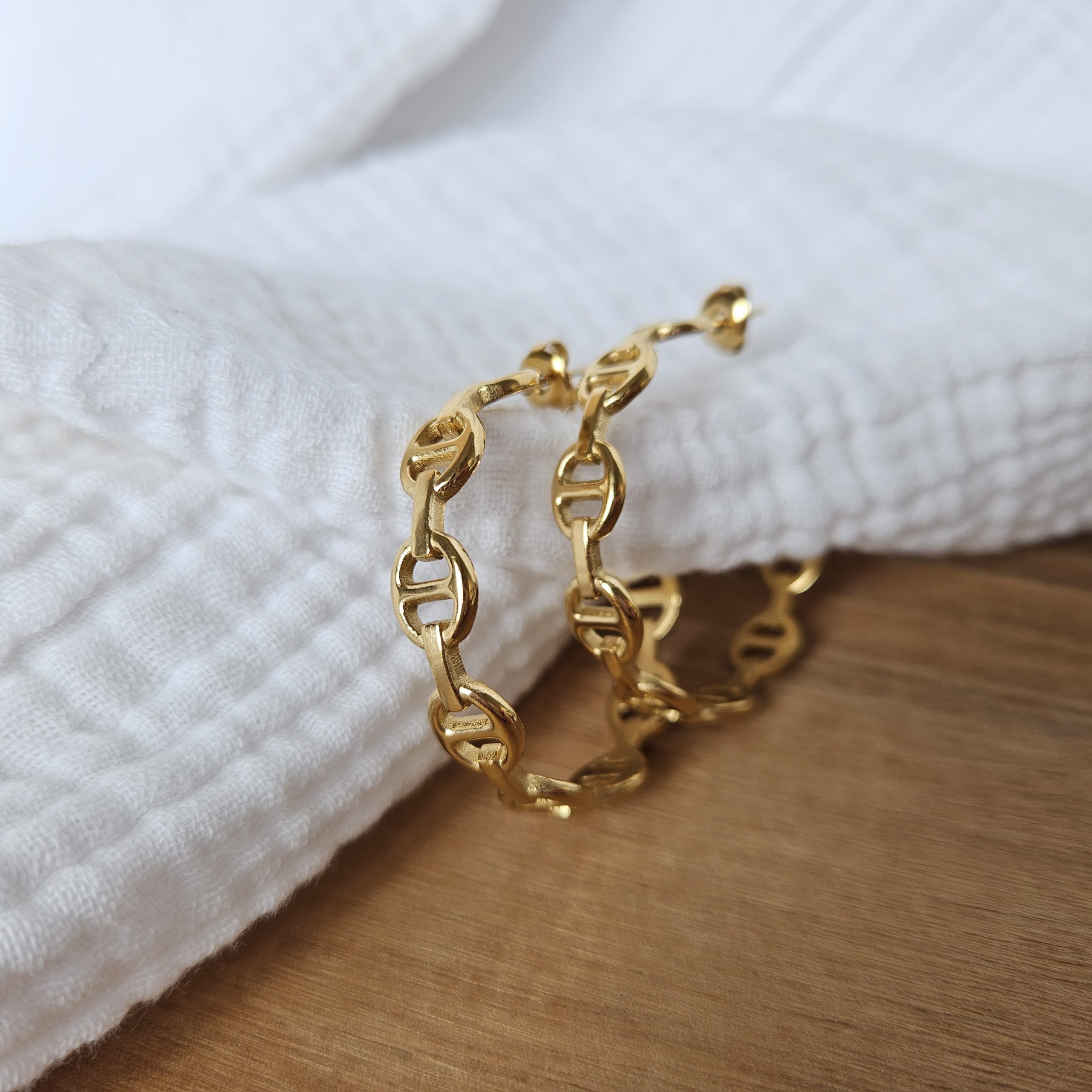 Découvrez nos boucles d’oreilles maille marine, en acier inoxydable doré.