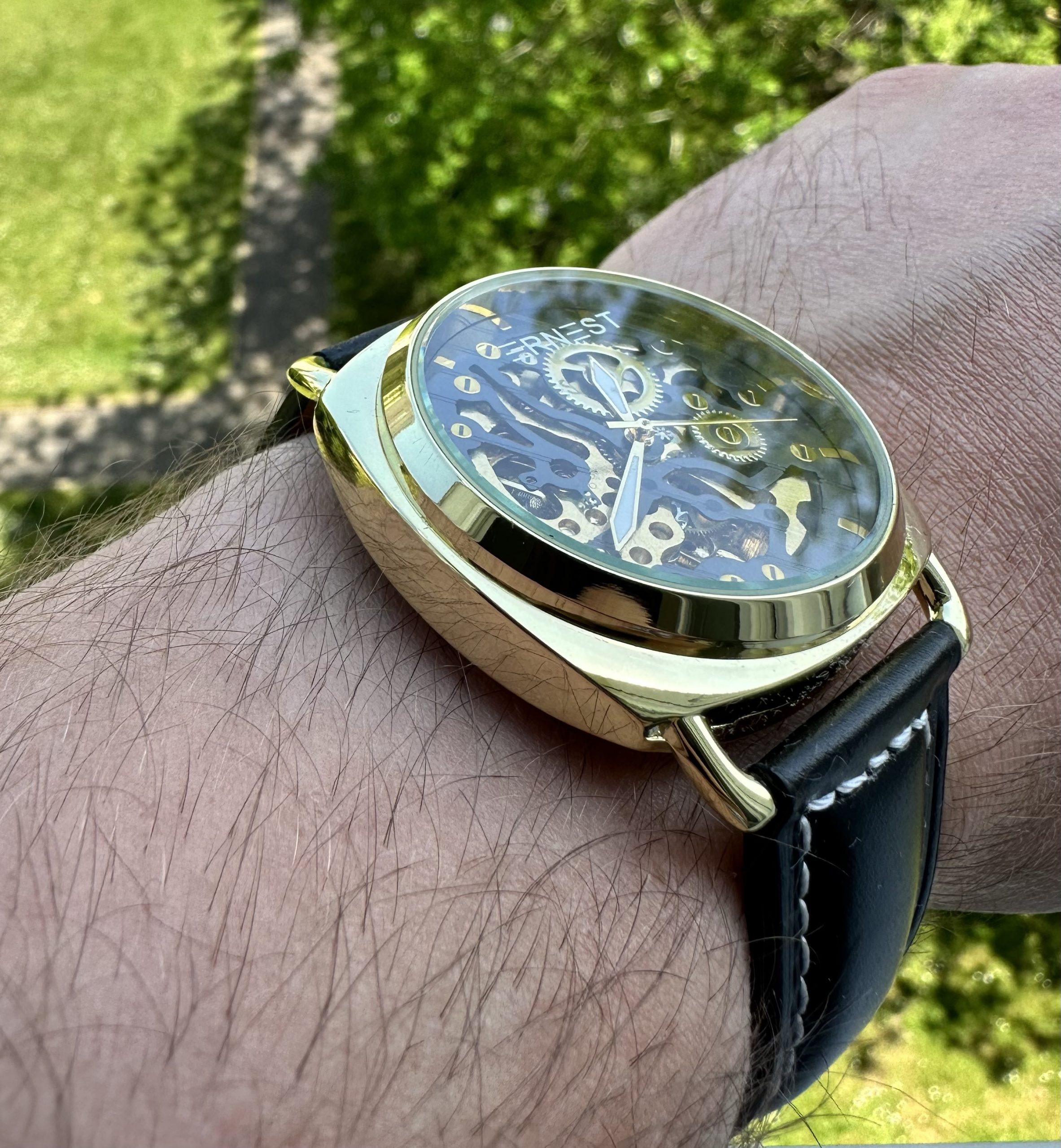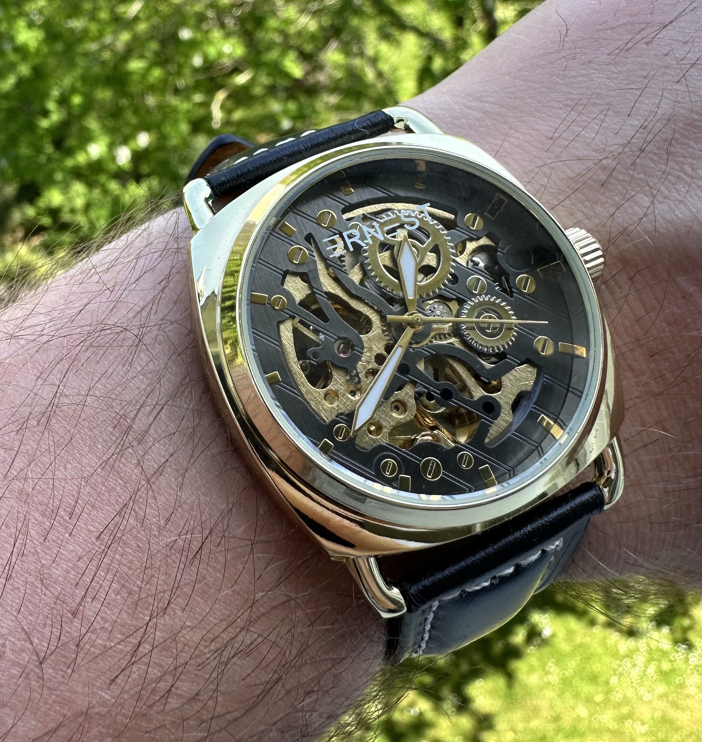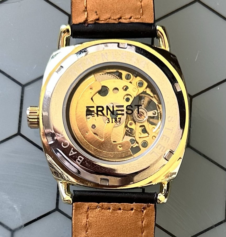 Avec son mouvement automatique, vous n’aurez jamais besoin de changer la pile de cette belle montre au boîtier coussin.